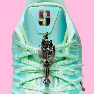 Branding stays intentional. A darkened Swoosh cuts across the sidewalls, while the tongue and heel keep Sabrina’s logo placements minimal. The standout accessory is the Liberty-inspired enamel lace jewel, a nod to her franchise and a detail that separates the All-Star edition from GR colorways without overcomplicating the design.