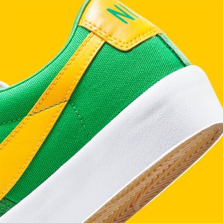 A possible nod to their Beverton roots — or even an ode to the Aussie skaters Down Under – Grant Taylor’s next Nike SB Blazer Low appears in a stunning Lucky Green upper split between canvas and suede, with piercing whites at the tongues, laces, and midsole wrap. Linking the themes is a sweeping University Gold Swoosh and rear overlay, before finishing off with everybody’s favorite outsole finish — gum rubber.
