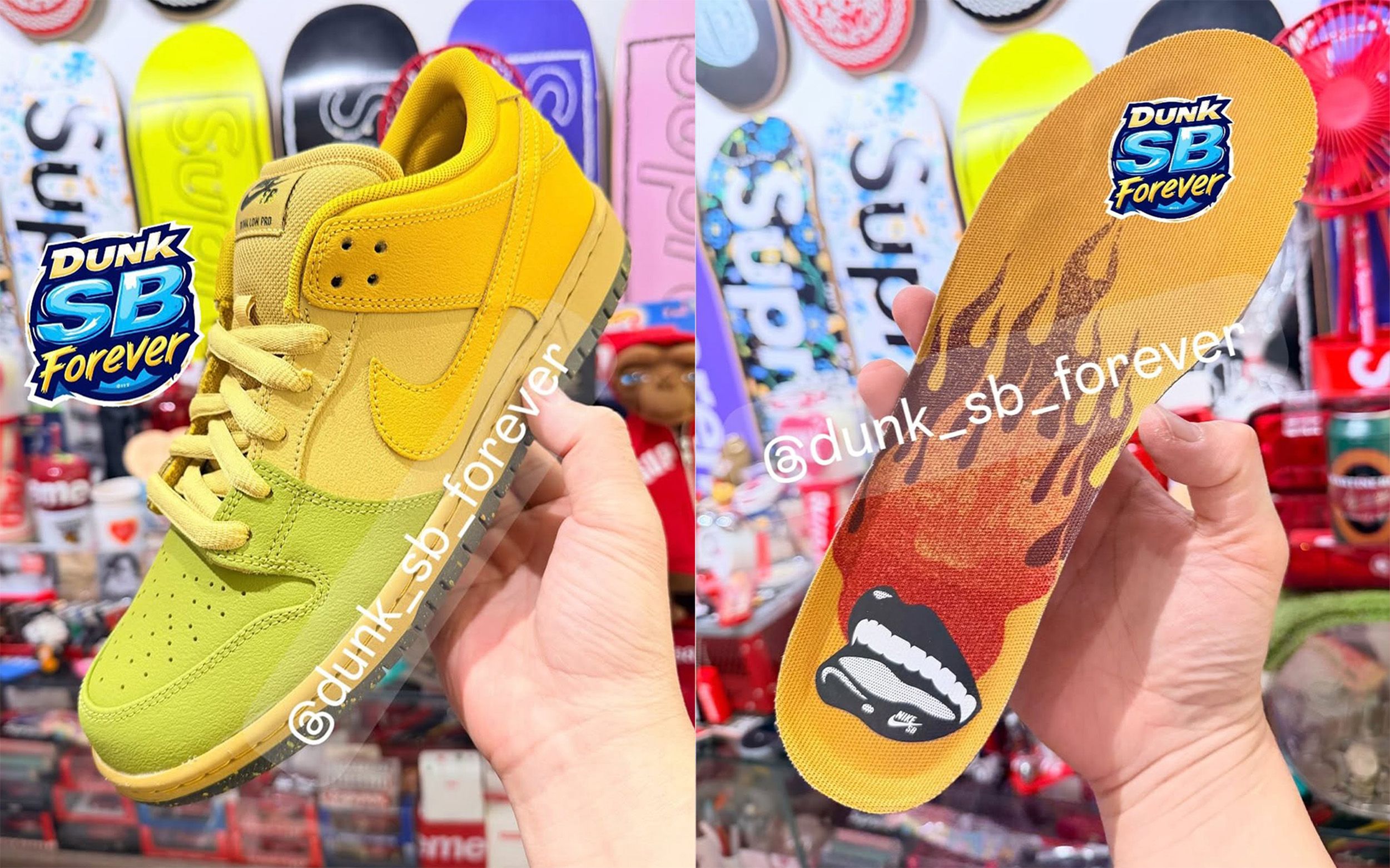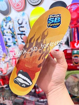 The Nike SB Dunk Low “Saffron Quartz” leans into retro skate motifs, most clearly highlighted by its graphic insoles. A bold flame pattern spreads across the footbed, capped by a playful “Dunk SB Forever” graphic near the heel. It’s a detail that feels pulled straight from late-90s and early-2000s skate culture, when loud graphics and personality-driven details defined the category.