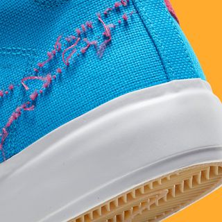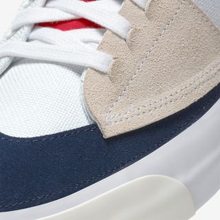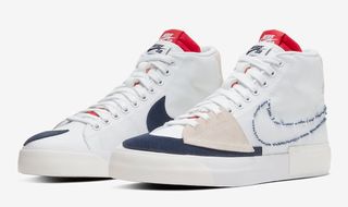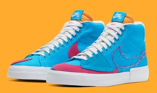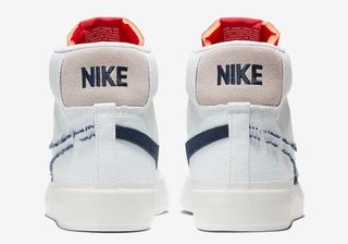 From fallen-off Swooshes, to tacked-on suede panels to cover tears, to sacai-inspired double-tongues, the Blazer truly sums up the tradition — although it looks a little weird for all of that to arrive on something that looks so squeaky clean. The first two colorways to appear are a clean, classic white, red and navy, with a second, more vibrant edition pairing neon blues and pinks with golden-yellow..