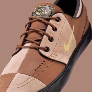 The upcoming Nike SB Janoski “Checkerboard” features a striking oversized chessboard pattern across the upper, alternating between panels of dark and light tan. The effect is amplified through the mix of textures, with sections cut from smooth suede and others from buttery nubuck. A golden-yellow embroidered Swoosh sweeps across the side wall, adding a flash of contrast without overpowering the design.