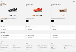 Finally, users enter their shoe size, and Nike provides a curated recommendation based on their selections. In a test run of the program, choosing road running, racing, and a one-mile race distance led to the suggestion of the newly released Nike Streakfly 2 Proto, a lightweight, high-performance shoe designed for speed, retailing at $180, as well as the Nike Rivale Fly 4, and the Nike Zoom Fly 6