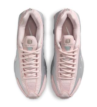 This "Barely Rose" colorway presents a fresh take on the classic Shox R4 silhouette, aligning perfectly with modern fashion trends while maintaining its roots in performance technology. The sneaker features a soft pastel pink upper complemented by shiny silver overlays, adding a touch of elegance and futurism to the design. The highlight of the sneaker, the Shox columns, are also tinted in a matching pink, enhancing the shoe's aesthetic continuity and visual impact.