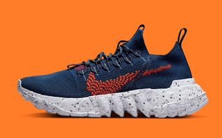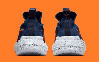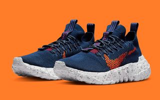 Here, the upper’s weave omits the signature fleck, opting for one in tonal navy hues. It’s contrasted by bold orange Swoosh stitching, red vamp threat, and maroon pull branding. All of this rests atop a white-based Crater Foam sole unit, with the pair then completed by the line’s signature recycled fibre insoles.