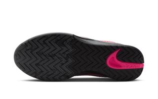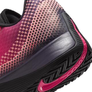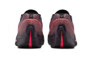 The upper transitions from bright atomic pink through deeper crimson and violet hues, creating a visual fade that feels right at home on sun-scorched cement. Black laces and lining provide contrast, while a coral Swoosh pops against the sculpted midsole. Along the lateral sidewall, textured dot patterns and layered mesh reinforce high-wear zones, balancing aesthetics with durability.