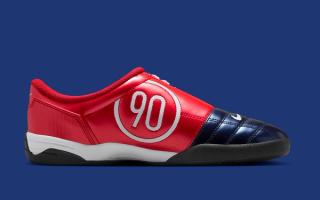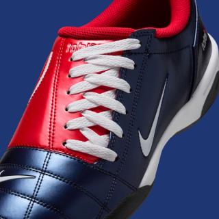 Ahead of summer, the indoor football shoe from 2004 has surfaced in a navy, white, and red color scheme. Although its glossy upper and gum black sole unit harken back to the performance footwear of yesteryear, the presentation evokes images of other "USA" and "Olympic" offerings from the Oregon-based company. Forefoot and lateral construction indulges in a deep navy tone, while lateral sides and collar lining deviate in ruby-colored flair. Large 90 branding steals the spotlight on the medial profile, while nods to the silhouette's name arrive on the offset tongue and lateral heel.