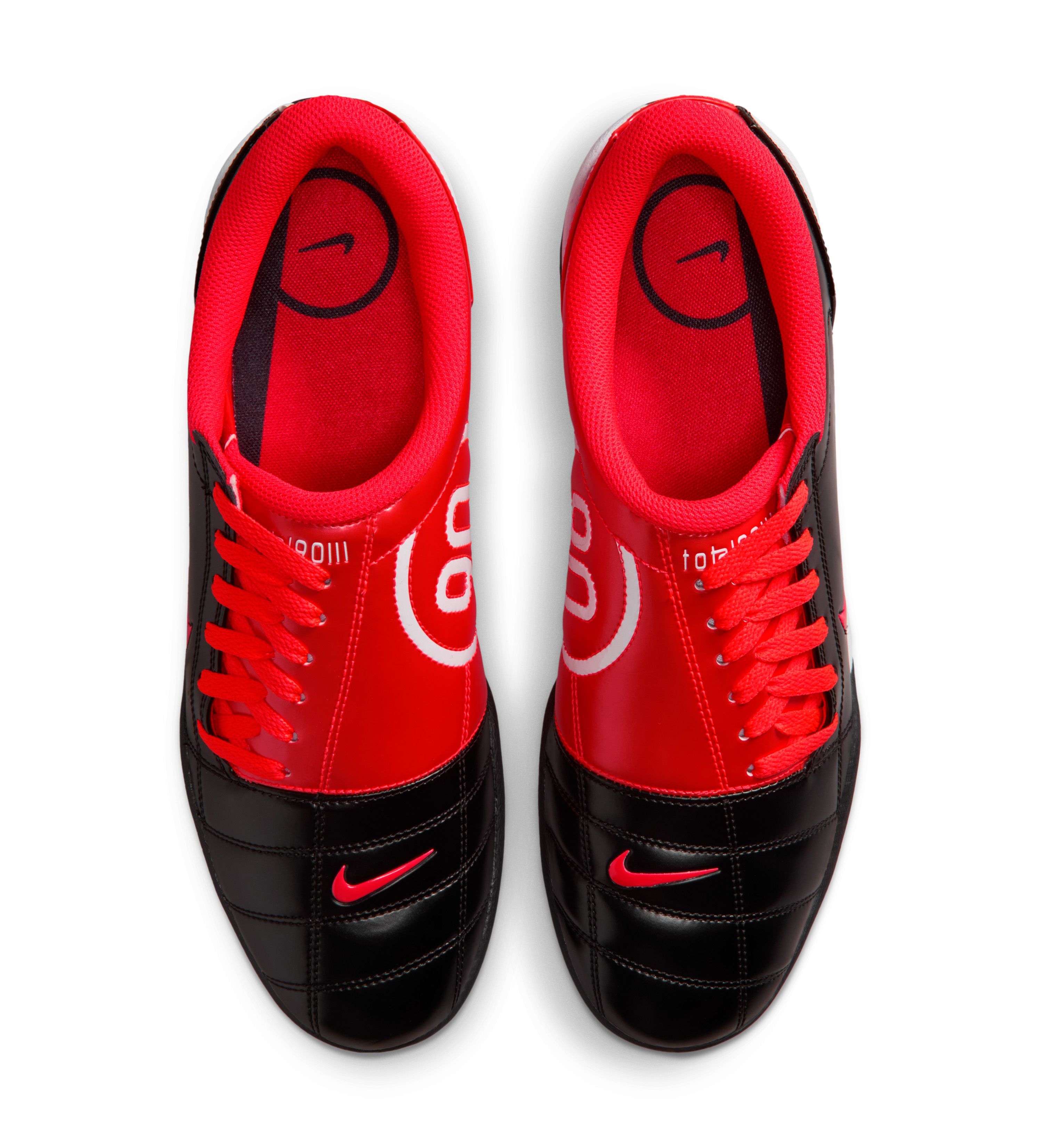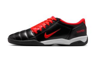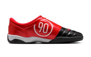 The timing feels deliberate. With football culture set to dominate headlines, Nike is leaning into one of its most recognizable color formulas. The black-and-red “Bred” scheme is inseparable from the brand’s legacy, largely thanks to its ties to Michael Jordan and decades of dominance in basketball. Translating that palette onto the Total 90 gives the indoor classic an unmistakable Nike identity, even as some football fans may immediately draw comparisons to AC Milan’s iconic strip.
