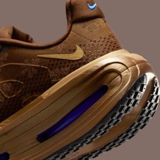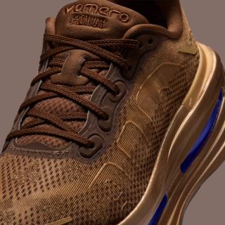 The midsole carries that same celebratory energy. Finished in a metallic gold-bronze hue, the exaggerated stack highlights the Vomero Premium’s maximalist identity, while deep blue Air Zoom units glow through translucent windows at the forefoot and heel. The contrast recalls classic Mardi Gras palettes, grounding the shoe’s boldness in cultural familiarity rather than spectacle for spectacle’s sake.