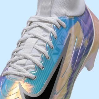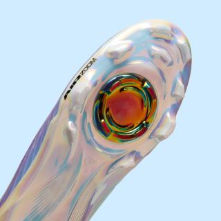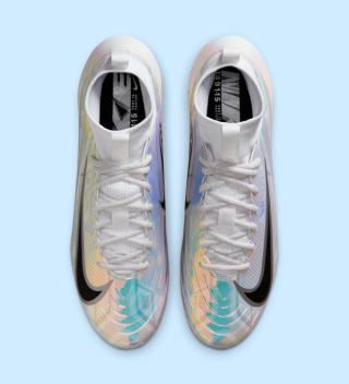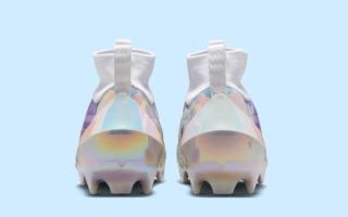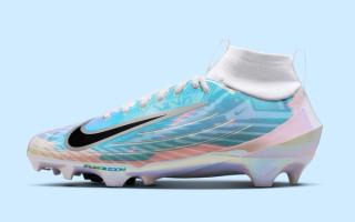 The Vapor Pro 1 arrives dressed in an iridescent, prismatic shell that shifts between soft blues, pastel pinks, and pearlescent hues depending on the light. It’s a look that feels futuristic without straying into novelty, pairing a translucent upper with sharp black Swoosh branding for contrast. The finish feels deliberate — flashy enough for the spotlight, restrained enough for serious on-field use.