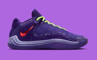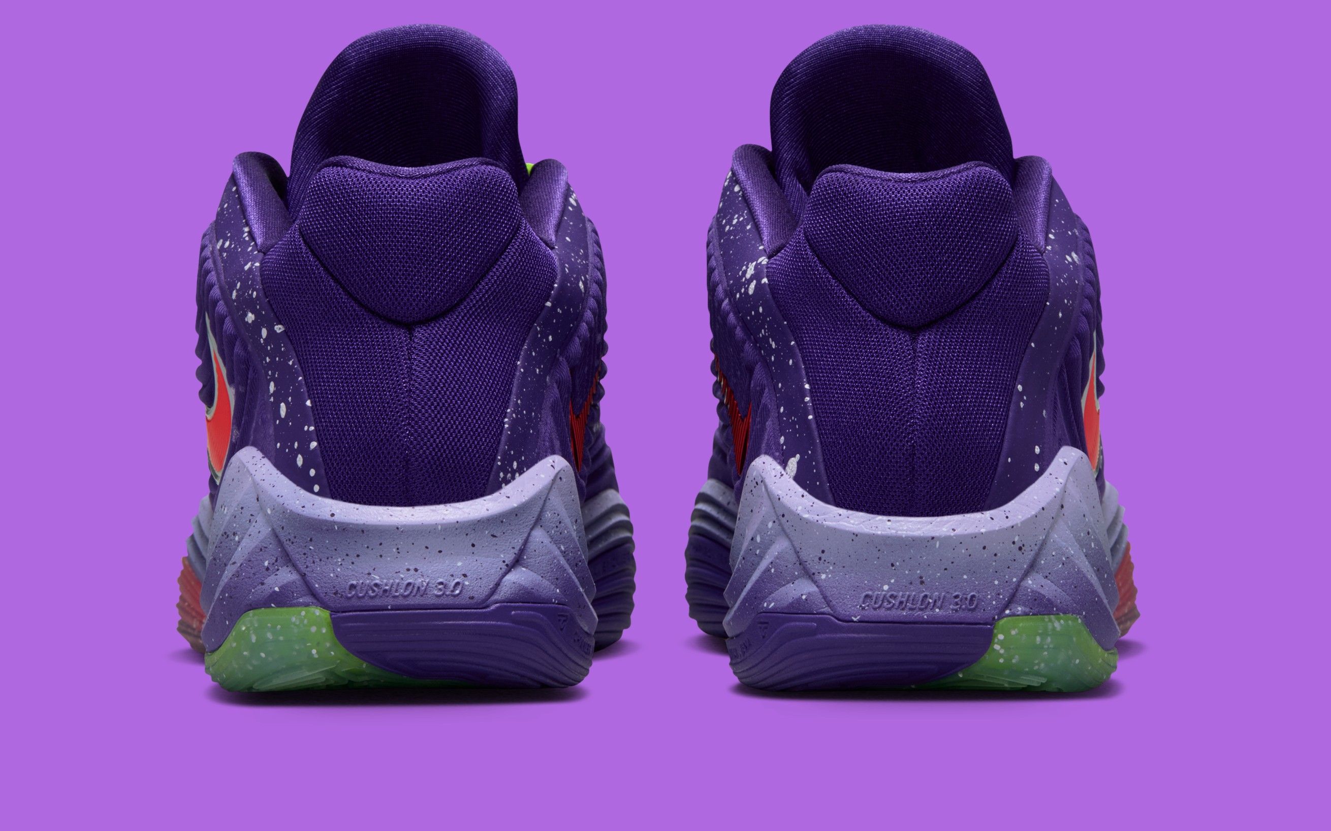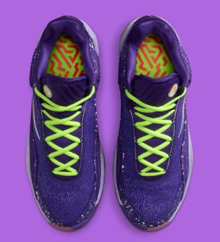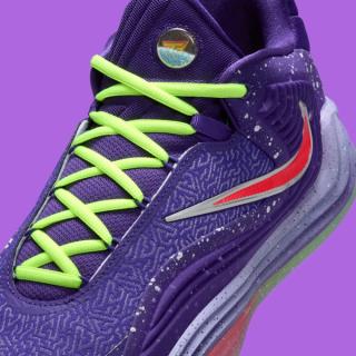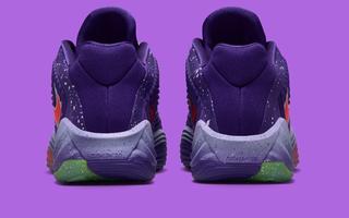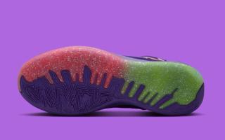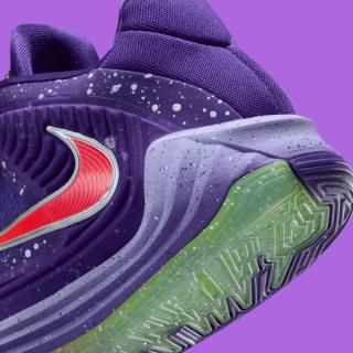 Vibrant contrasts define the rest of the design. A bright infrared Swoosh stretches across the lateral side, outlined in metallic silver for added dimension, while the neon Volt laces and tongue accents inject the kind of bold energy that has become synonymous with Giannis’ signature line. Underfoot, a gradient midsole blends icy purple into cool grey, sitting atop a translucent outsole split between Volt and crimson traction zones—delivering grip and visual punch in equal measure.