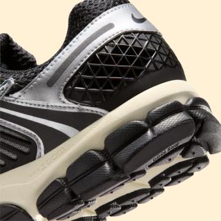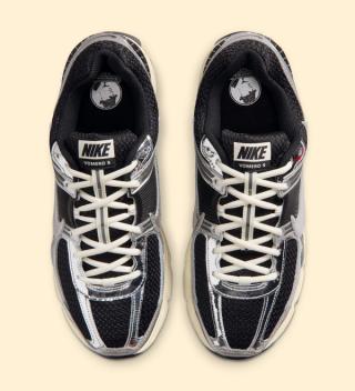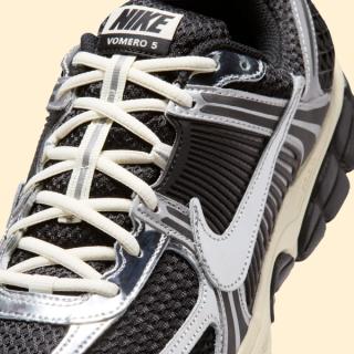 The Nike Zoom Vomero 5 "Black & Coconut Milk" leans into the model’s signature layered construction, pairing breathable black mesh with a mix of metallic silver overlays and molded TPU caging across the midfoot. The reflective finishes and structured panels recall the original late-2000s running design language, while the crisp white leather Swoosh keeps the look grounded within Nike’s classic visual playbook. Cream-toned laces and a Coconut Milk midsole introduce a subtle aged effect that fits neatly within today’s lifestyle-focused interpretation of performance runners.