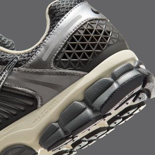 The upper keeps its signature combination of open mesh, leather, and glossy synthetic overlays, but the shift to iron grey tones instantly updates the feel. Chrome-finished panels sit across the toe, eyestays, and midfoot, catching light without overpowering the design. The molded TPU cage—one of the Vomero 5’s defining features—arrives in a muted charcoal shade, giving the shoe its structured, ribbed texture without adding unnecessary contrast.