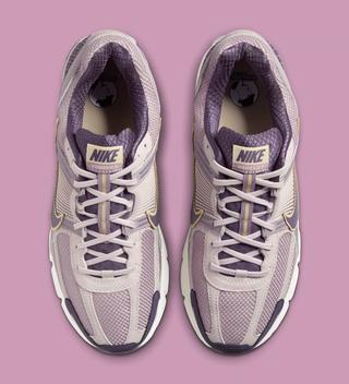 Constructed from a classic combination of mesh, leather, and synthetic materials, the "Platinum Violet" Vomero 5 maintains the line's reputation for comfort and durability. These materials contribute to the shoe's functionality and stylish, multi-textural appearance.