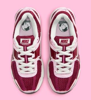 The Nike Zoom Vomero 5 "Valentine's Day" leans heavily on maroon hues, presenting mesh uppers, cage mid panels, and forefoot overlays awash in this rich color. To accentuate its Valentine's theme, a deep "Team Red" shade is masterfully worked into the Swooshes, outsoles, and midsole trim, infusing the shoe with a romantic energy that's hard to miss.