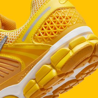 Here, the pair proffers a striking yellow upper, and clean white mesh overlay before layer upon layer of overlays is piled on. From orange suedes to smooth yellow leathers, to muted orange midfoot caging and matte silver swooshes, the upper half is loaded with intrigue. A clean white midsole rests below — with laces mirrored to match — and under that, a two-tone rubber sole unit completes the design.