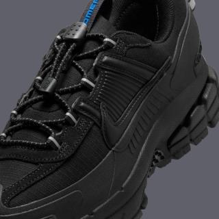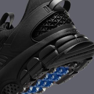 The upper is cloaked in robust black ripstop mesh, ensuring durability and breathability. Contrary to the design's all-black arrangement, reflective accents catch the light, ensuring visibility during evening or early morning treks. A striking Racer Blue highlight at the tongue energizes the design, appearing on the pull tabs above the toggle lacing system, which guarantees a quick, secure fit tailored for on-the-go adjustments.