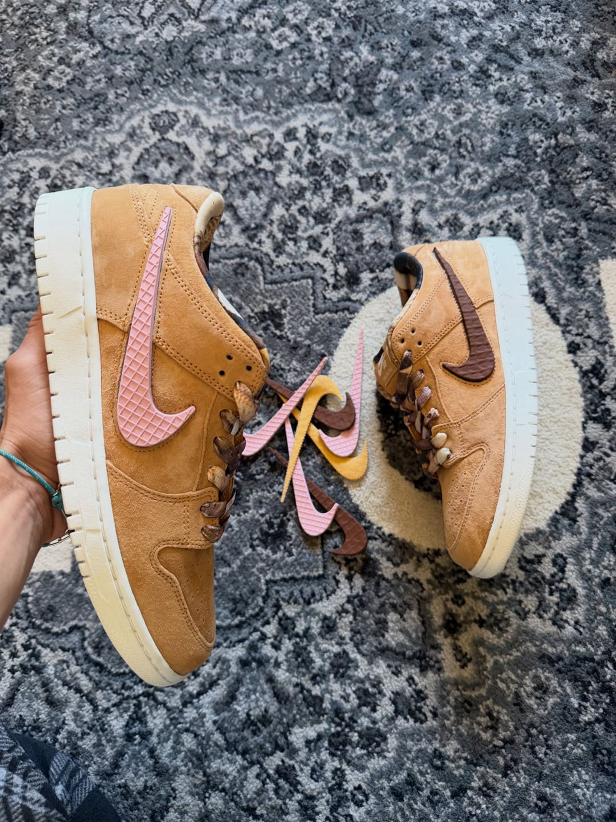 The design is heavy on thematic storytelling, featuring a buttery Flax brown suede upper sitting atop a crisp white sole unit. Beyond the warm colorway, several unique features cement this pair as a cultural deep cut: