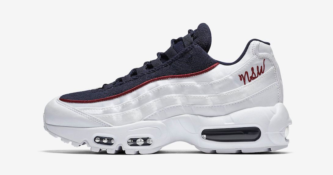 The first AM95 of a predicted many pairs to don the NSW monogram is this split colorway, which arrives in a patriotic mix of navy, white and red. Navy rides the upper portion, with white engulfing the lower, seperated by a blood red piping, matching the NSW embroidery which sits in place of the traditional mini-Swoosh