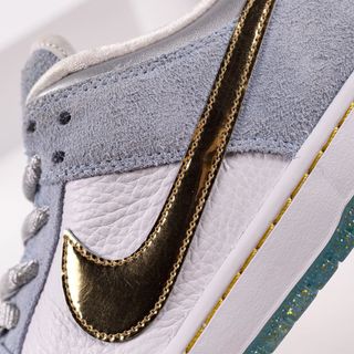 The Sean Cliver x Nike SB Dunk Low is tipped to arrive later this year, pictured here with a light blue suede and white tumbled leather upper, metallic gold Swoosh logos, glittered green jelly soles, and a supple velour-esque lining on the interior that s undoubtedly a tribute to his aforementioned Strangelove release from earlier this year. The insoles feature Sean’s signature artwork as well, all of which point to a potential release for Christmas.