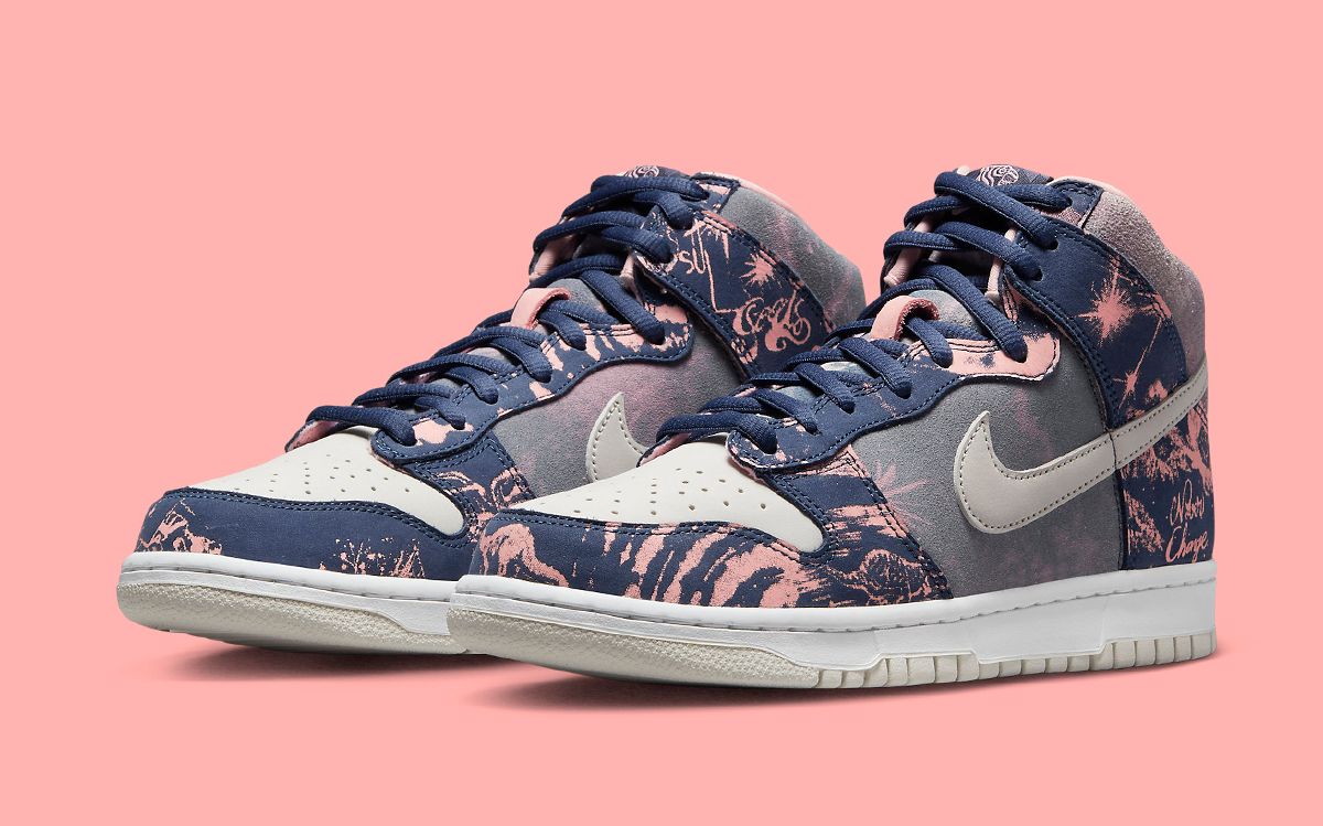 Constructed in a majority of suede and nubuck, the pair is quick to show its character through a slew of artisan illustrations — and “Never Change” insignia — in pastel pink. They dress the navy blue nubuck overlays in stark contrast whilst working in a more subdued manner on the muted steel suede. Beige Swooshes and white toe boxes prefer a smooth leather finish and solid color blocking and are mirrored underfoot by the two-tone sole unit stacked below. Completing the design is the pack’s customary co-branded tongues, sock liner embroidery, and special-edition packaging.