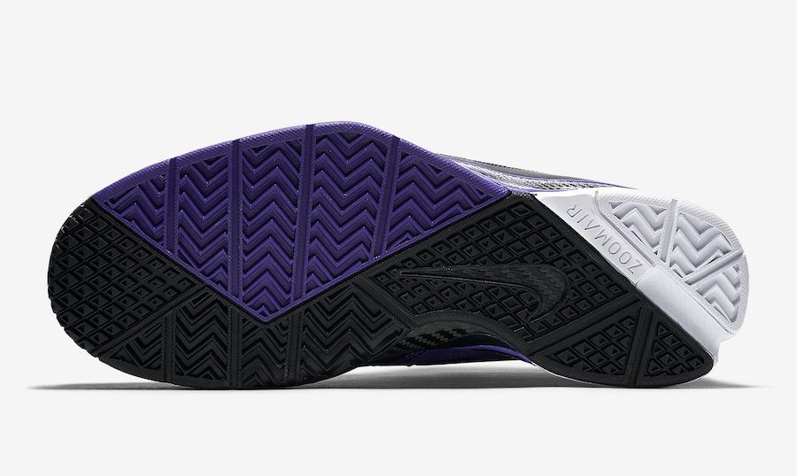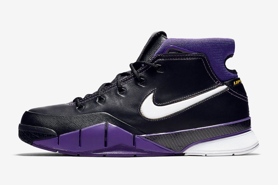 This edition of the Nike Kobe 1 Protro takes on the Lakers’ black alternate uniforms, featuring a trio of black, purple and white. Black is predominant on the upper, carbon fibre heel shank and towe cap, with purple hitting the midsole, sock liner and medial ankle, with white-soled heels and Swooshes to complete the design.