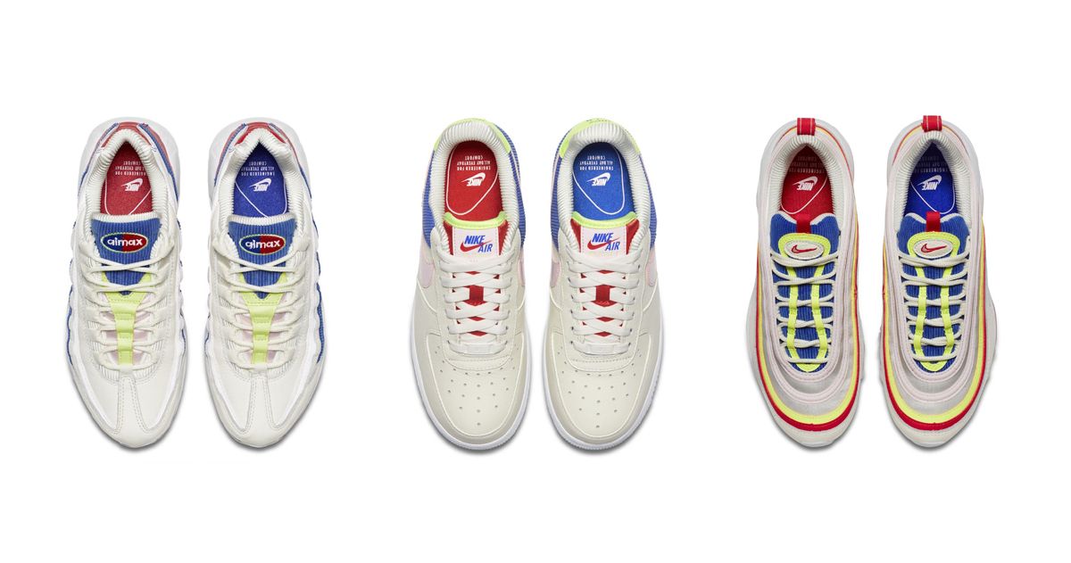 You’re spoilt for choice with cord hitting the Air Force 1 Low, Air Max 95 and Air Max 97, each silhouette coming built up with vibrant pops of blue, red and yellow corduroy sitting on buttery sail leather with hints of faded pink.