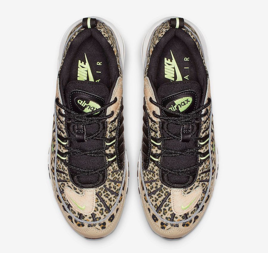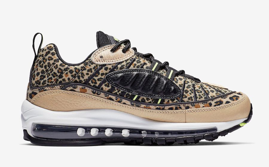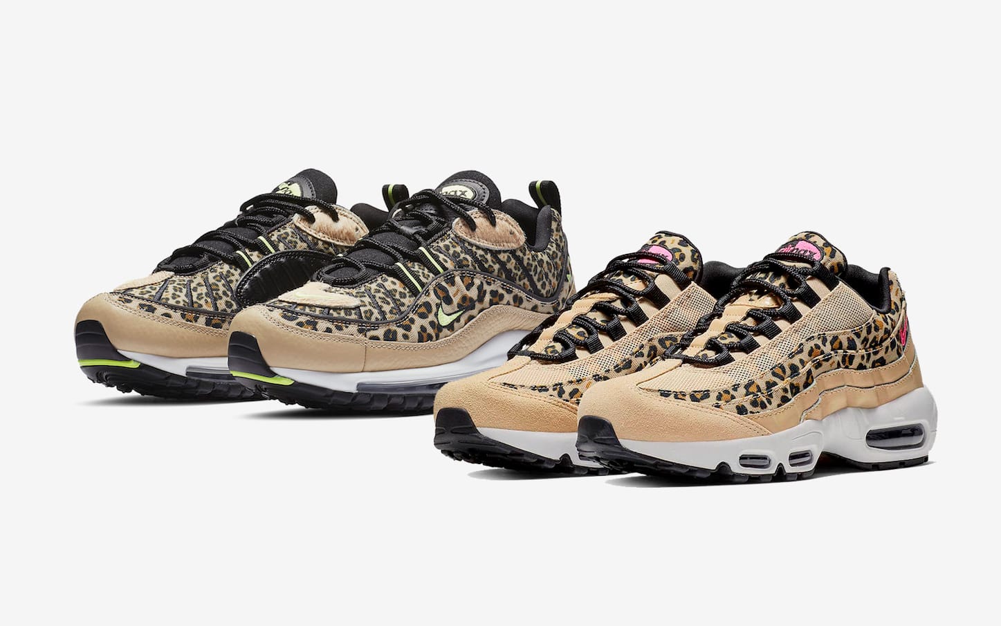 While the Air Max 95 and Air Max 98 both feature the Leo-print, the differ from the 97s, opting for more subdued, earthy complimentary tones. Both pairs featuer tans, whites and black, each arriving with a pop of vibrant pink and green branding. Take a peep below: