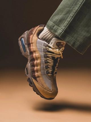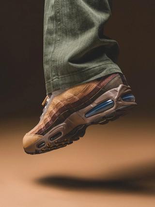 The first pair to appear features an earthy mix of browns and greens, fitting the natural palette often associated with Oregon athletics and the Pacific Northwest. The upper showcases layered textures across the Air Max 95’s signature wave panels, including suede, leather, and mesh components. A wooden Oregon “O” hangtag further ties the design back to the university, adding a subtle collegiate touch to the otherwise understated build.