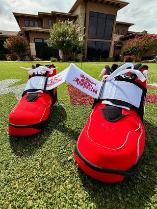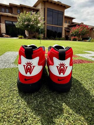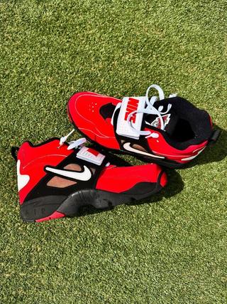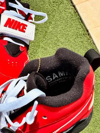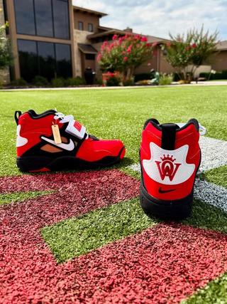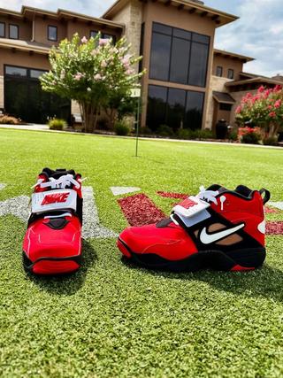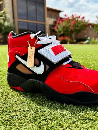 The signature silhouette in question is the Nike DT 92, a model long associated with Deion’s on-field dominance in the 1990s. This newly revealed sample stays true to the bold DNA of the OG but brings a fresh, narrative-driven twist through collaborative details. Rendered in a striking red, white, and black colorway, the pair features mesh windows and aggressive paneling reminiscent of the original, but it’s the accessories that elevate this edition.