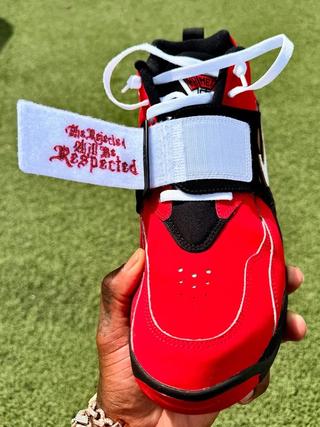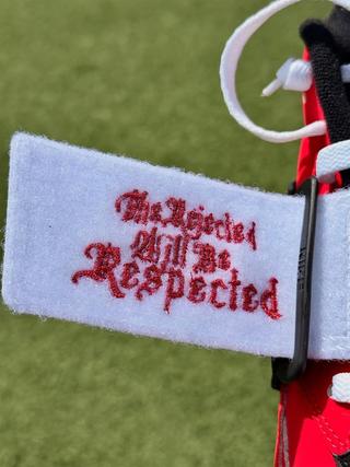 At the medial Velcro strap, an embroidered message reads: “Those Rejected Will Be Respected”, a sentiment tied to Sanders’ ethos and motivational style. Further nods to the family brand are evident in Well Off Forever-branded heels, while a red Nike wordmark is stamped across the forefoot strap, completing the bold design.