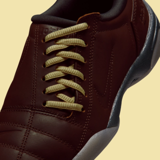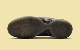Enlarged 90 branding on the medial profile abandon its typical contrasting presentation in favor of a simple stitch pattern that could easily go unnoticed if not being paid attention to. Laces introduce a yellowish tone into the mix, but the remainder of the indoor football model indulges in drab black and grey hues.