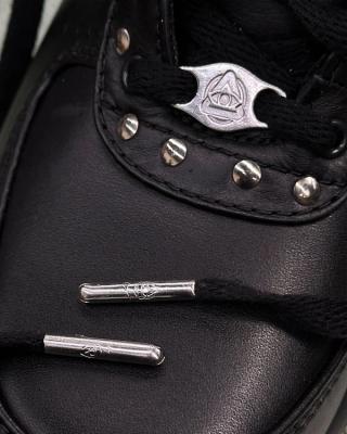 Taking on the rugged Goadome silhouette—a staple in Nike’s All Conditions Gear (ACG) lineup—the pair is dressed in premium black leather and features silver rivet detailing across the upper, lending an industrial, high-fashion edge to the boot’s traditional trail-ready build. Custom metallic hardware, including engraved lace tips and dubraes featuring Yeat’s signature symbol, amplifies the design’s exclusivity and attention to detail.