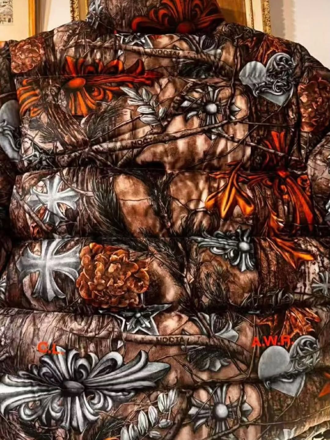 The capsule blends NOCTA’s performance-rooted foundation with Chrome Hearts’ unmistakable luxury codes. From early looks, the collaboration leans heavily into Chrome Hearts’ signature visual language, incorporating dense all-over prints, gothic cross motifs, and premium construction. One standout piece is a puffer jacket featuring an intricate camo-style pattern layered with Chrome Hearts iconography, including cross emblems and ornamental detailing woven throughout the fabric. Blacked-out NOCTA and Chrome Hearts branding appears subtly integrated rather than overtly stamped, keeping the focus on materials and craftsmanship.