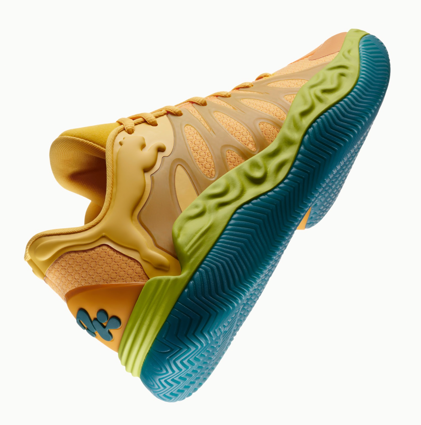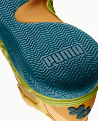 Designed in collaboration with Salehe Bembury, the PUMA Hali 1 “Halucinating” continues the rollout of Haliburton’s debut signature model with a bold mix of orange-ish, green, and teal tones across the futuristic silhouette. The shoe features sculpted overlays across the upper, giving the design its distinctive flowing structure.