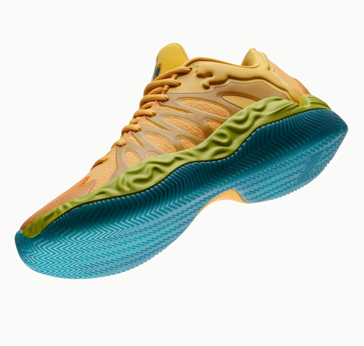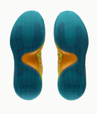 Underfoot, PUMAGRIP rubber delivers durable traction through a high-abrasion compound and aggressive herringbone pattern built for hardwood courts.