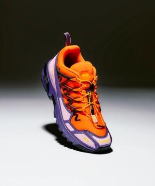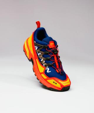 A graphic, colorful homage to emblematic pieces from Salomon’s wintersports legacy, reminiscent of the design intent behind its heritage skis, ski boots, and overall ambiance, the collection sports three vivid colorways; "Dragon Fire/Purple Regin," "Black/Pink Glo," and "Cherry Tomato/Blue Print."