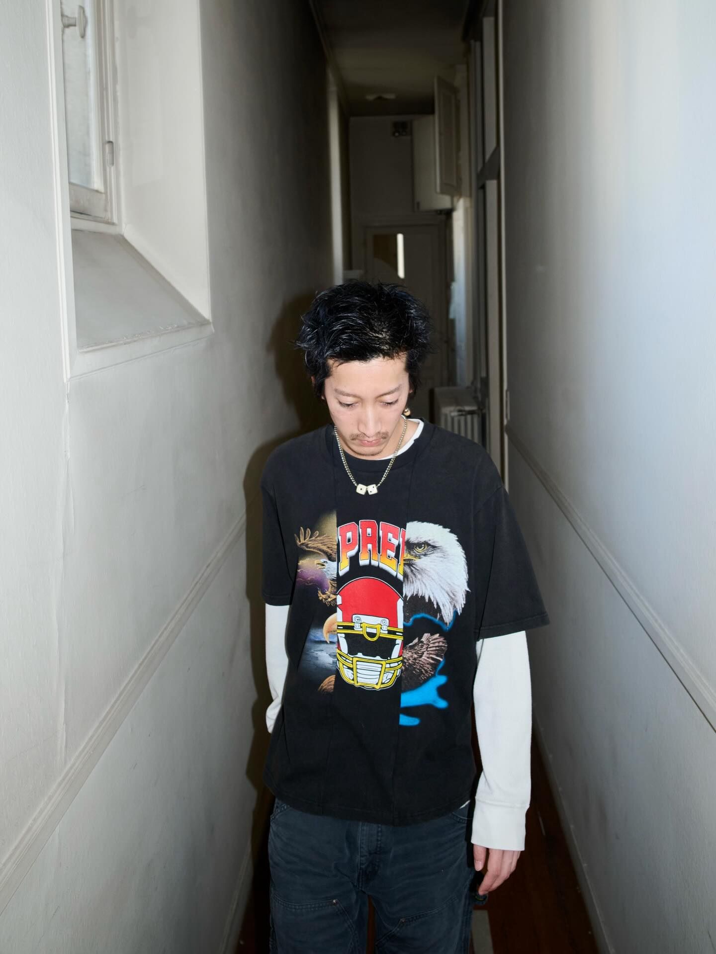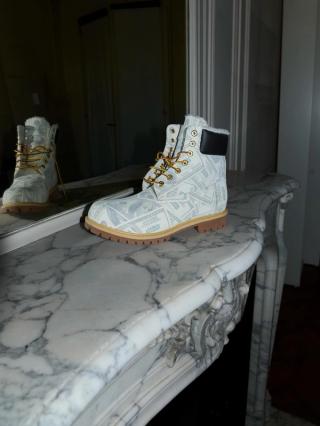 The lineup spans a broad mix of outerwear, denim, and graphic apparel. Highlights include a split stadium jacket, a hooded shearling bomber jacket, and a Schott® leather jacket that nods to classic American outerwear. A distressed selvedge denim trucker jacket arrives alongside matching distressed selvedge denim pants, reinforcing the collection’s worn-in aesthetic. The collection also features collaborative Timberland boots, pictured below.