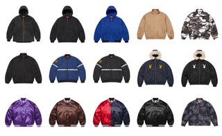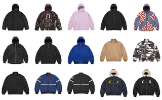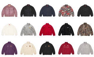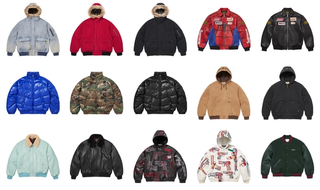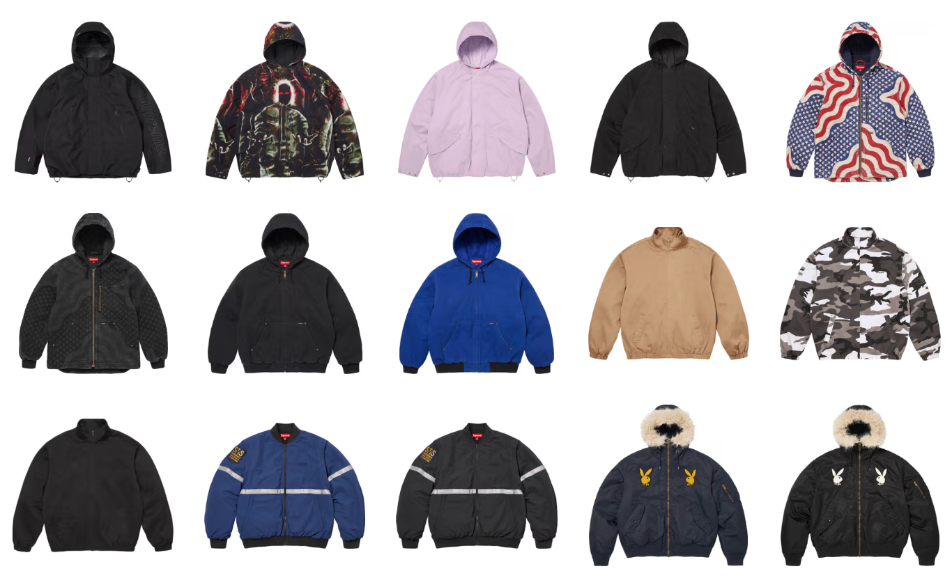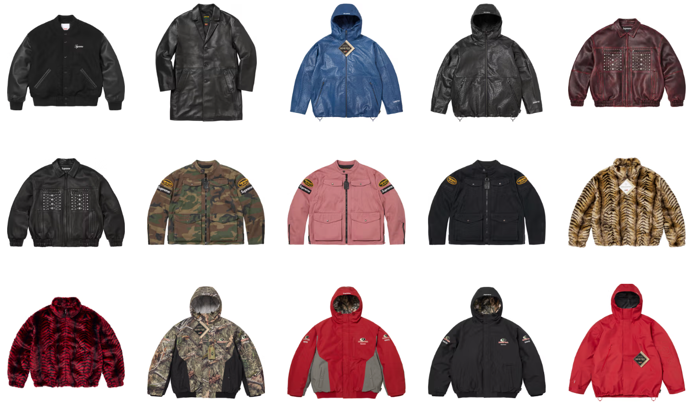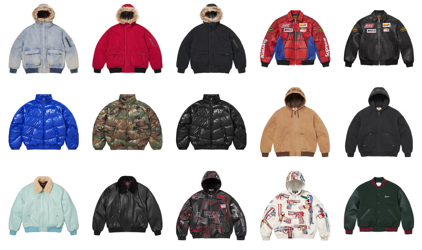 The lookbook highlights a mix of bold prints and classic staples ncluding collaborative pieces with Marvel's Spider-Man. Graphic-heavy tops sit alongside more minimal logo treatments, while patterned button-ups and sports-inspired jerseys nod to Supreme’s long-standing connection to skate and athletic aesthetics. Outerwear remains a focal point, with leather jackets, racing-style pieces, varsity silhouettes, and fur-trimmed parkas adding structure to the lineup.