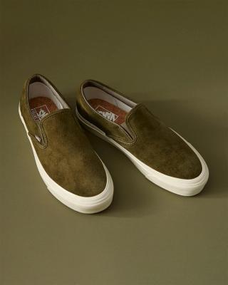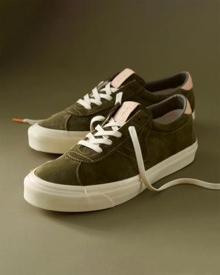 Both are swathed in a luxurious "Snyder Olive" green vegetable-tanned suede upper, complemented by premium tan accents on the tongue and heel. Light cream laces with orange tips and a vulcanized outsole create an elegant appearance suitable for a posh cocktail bar while still being perfect for a quick skate to the next destination. Todd Snyder and Vans co-branding adorns the leather tongue label and is screen-printed on the cork insoles, preserving the clean, ageless aesthetic.