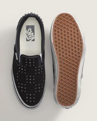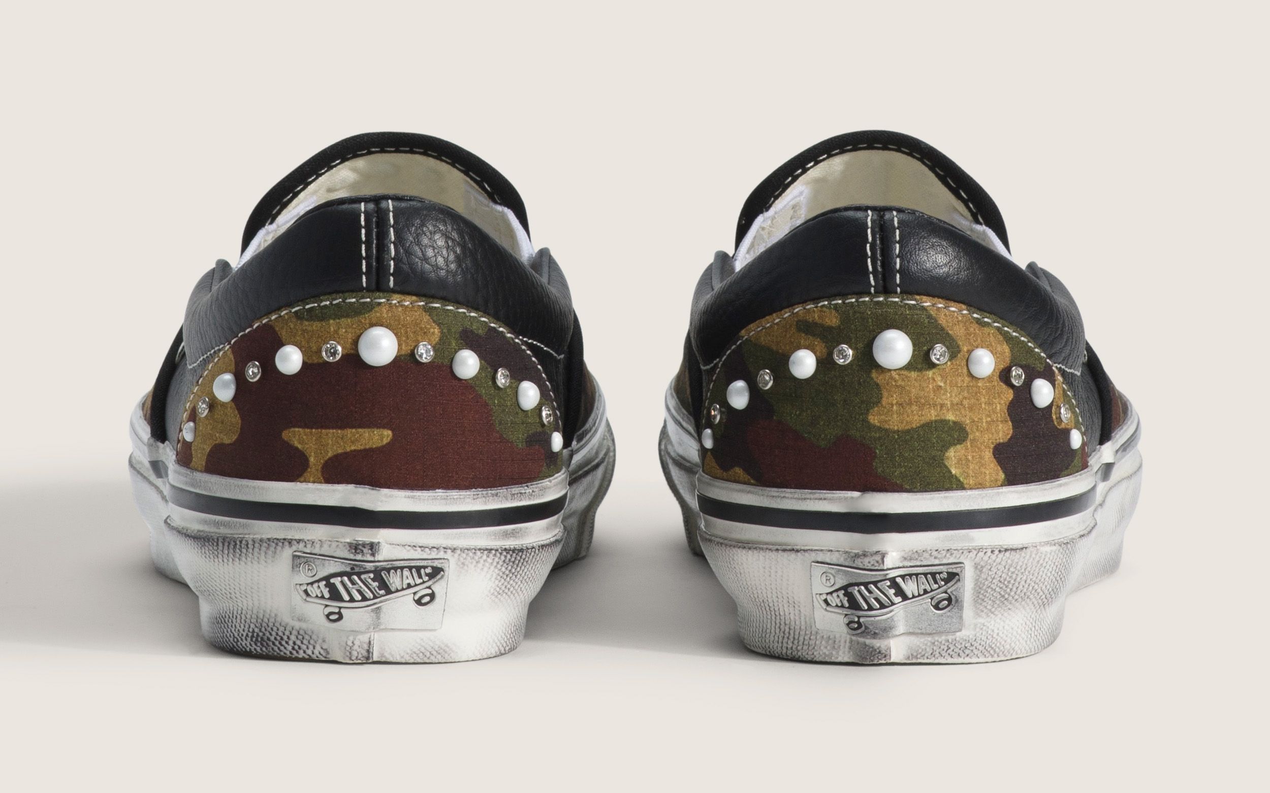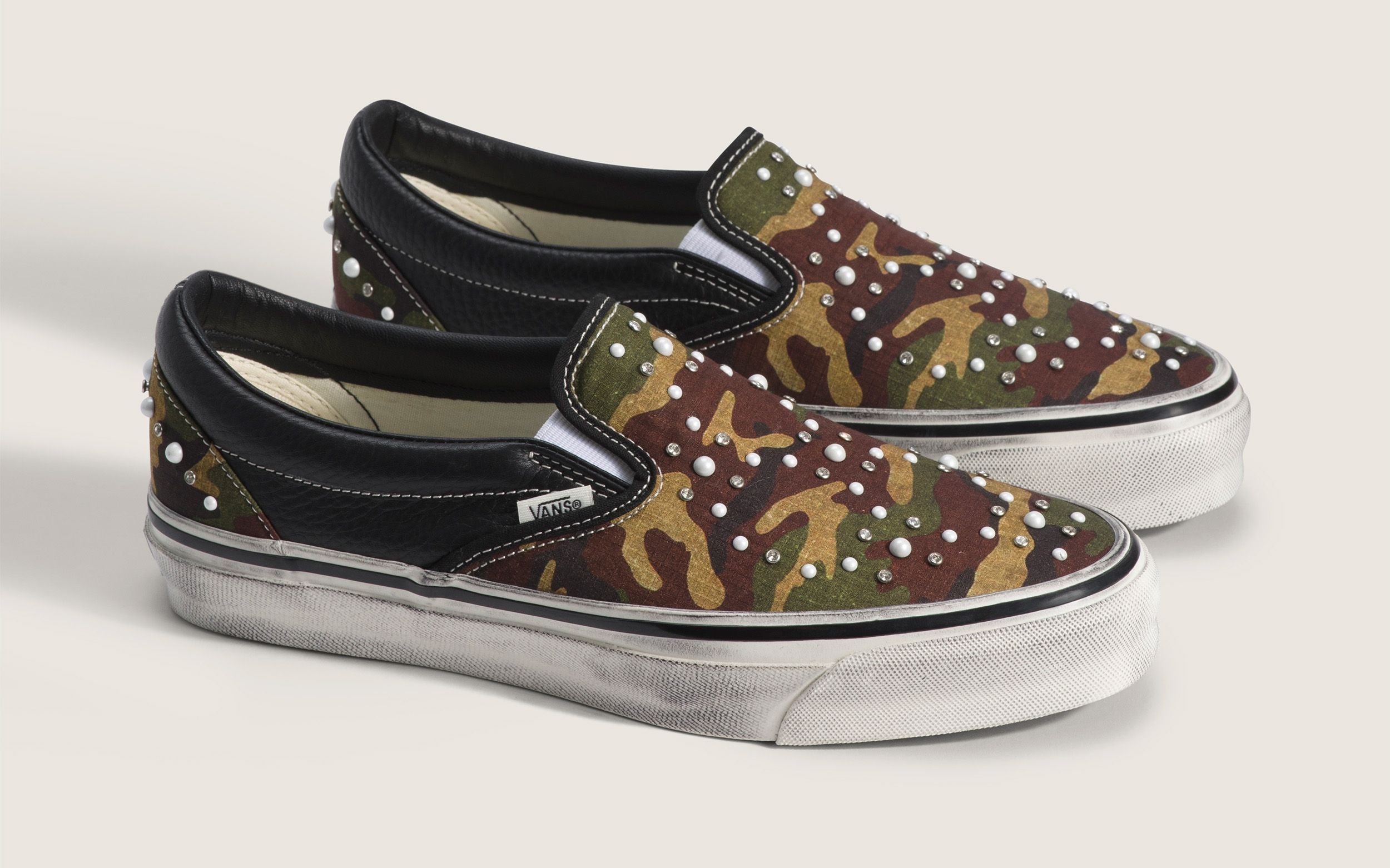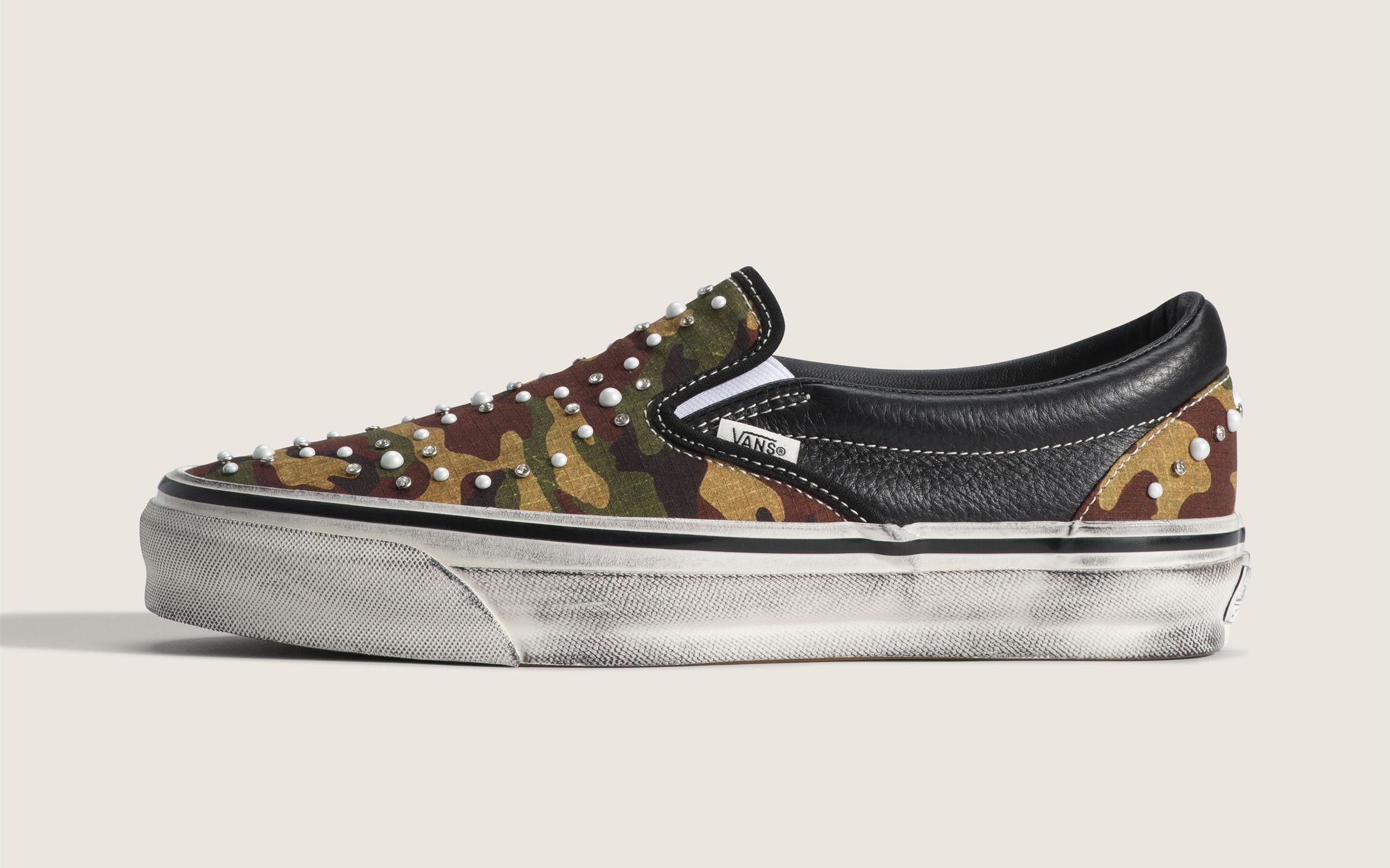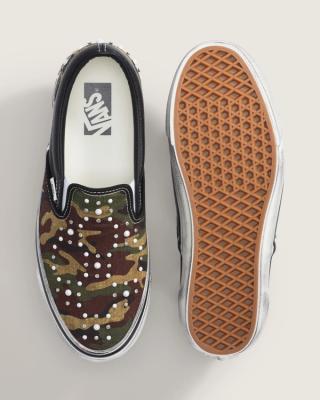 The Classic Slip-On arrives in several variations, including a deep navy canvas option with white pearl accents, a black edition with darker metal studs, and a camouflage pair that blends military-inspired patterns with decorative beadwork. Each version retains the silhouette’s elastic side panels and low-profile shape while introducing a bold visual twist.